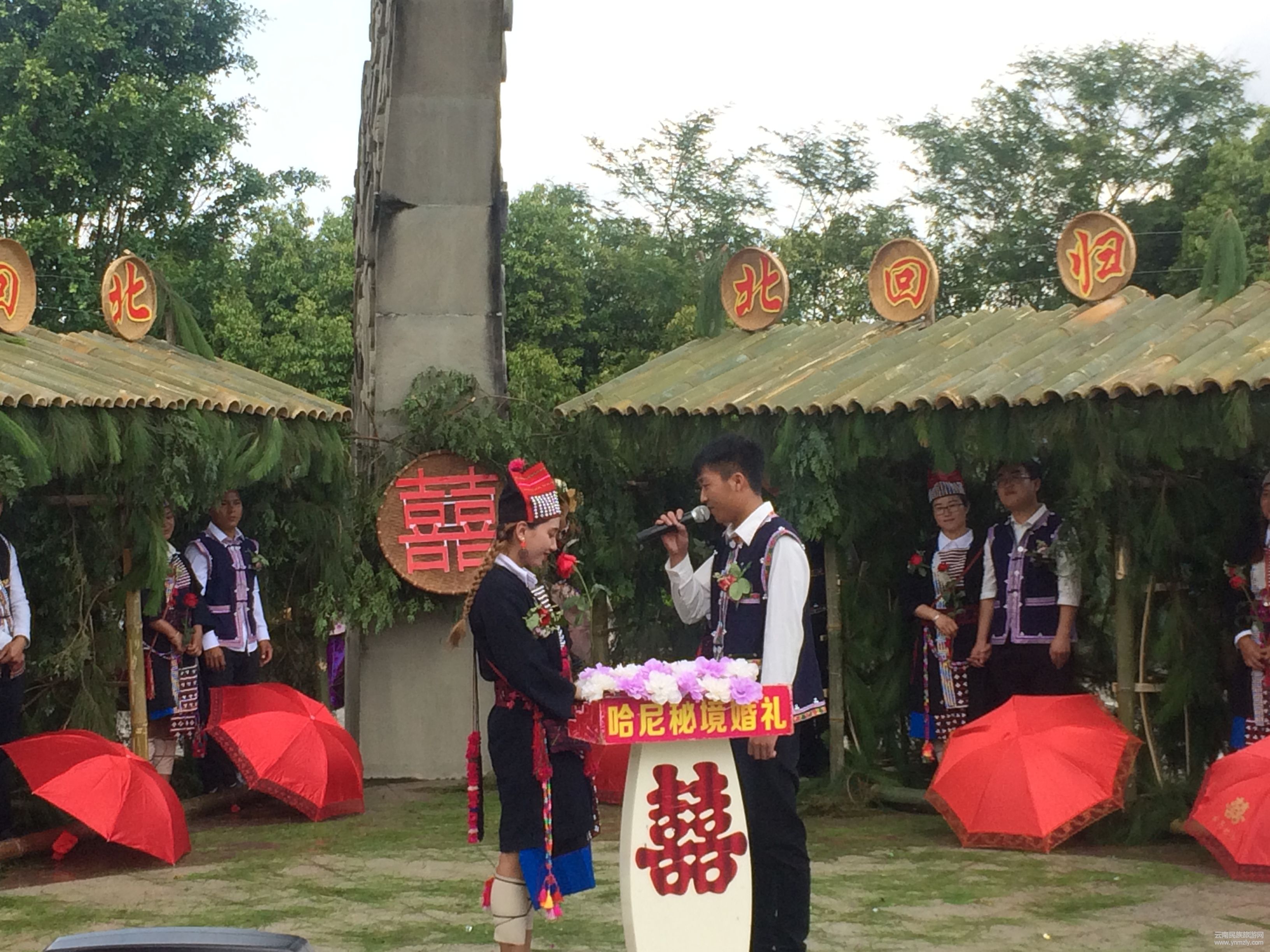 巡游結(jié)束后,在墨江北回歸線標(biāo)志園頂舉行了哈尼秘境婚禮生動(dòng)再現(xiàn)了哈尼族阿木支系的傳統(tǒng)婚俗,通過(guò)橄欖迎親、說(shuō)親、郎舅背親、哭嫁、送嫁、郎舅堵門等一系列婚禮流程,新人們終成眷屬,共飲雙胞水等一系列活動(dòng)。看著他們滿臉幸福的準(zhǔn)備攜手一生,現(xiàn)場(chǎng)的觀眾心里充斥著滿滿的感動(dòng)。