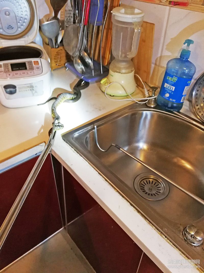 6月20日22:30分許,大理古城的楊先生已準(zhǔn)備就寢,突然聽(tīng)到廚房里傳來(lái)異常的聲音,以為是家里進(jìn)老鼠了,于是起身去廚房檢查,誰(shuí)知?jiǎng)偺崞鸱胖缅佺P、湯勺等廚具的收納架,就鉆出一條菜花蛇,毫無(wú)心理準(zhǔn)備的楊先生嚇壞了,于是報(bào)警請(qǐng)求救助。