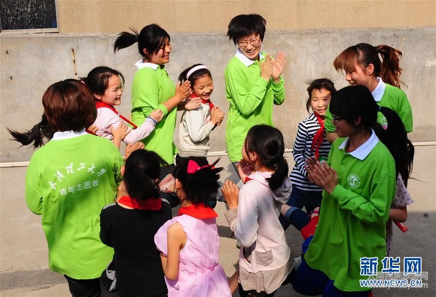 2011年4月28日,武漢理工大學(xué)研二學(xué)生郎坤和農(nóng)民工子弟學(xué)校武漢凌智小學(xué)的孩子們一起在屋頂平臺(tái)上做游戲。新華社記者 程敏攝