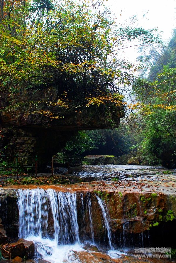 水上舞臺 舞臺寬10米,長24米,向西傾斜,水流順巖面裂隙流下并漫過石板,從高約2米的小陡坎跌落,形成一小瀑布,飛花碎玉似的撤向下游。在舞臺上方有一長約6米,寬4米形如巨龜?shù)拇笫缥枧_的天然遮棚,既可遮陽,又可避雨,絕妙無比。
