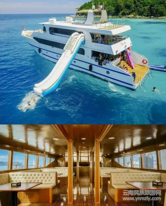 資料顯示,“鳳凰號(hào)”寬8米,長38米,最大載客量為200人。其內(nèi)部分為4層,底倉是廚房和休息室,首層為餐廳和潛水裝備區(qū),二層為船長室、露天、室內(nèi)休息室和兒童戲水區(qū);三層則為陽光甲板,配備按摩浴缸,同時(shí)設(shè)有滑梯,游客可以體驗(yàn)直沖入海。