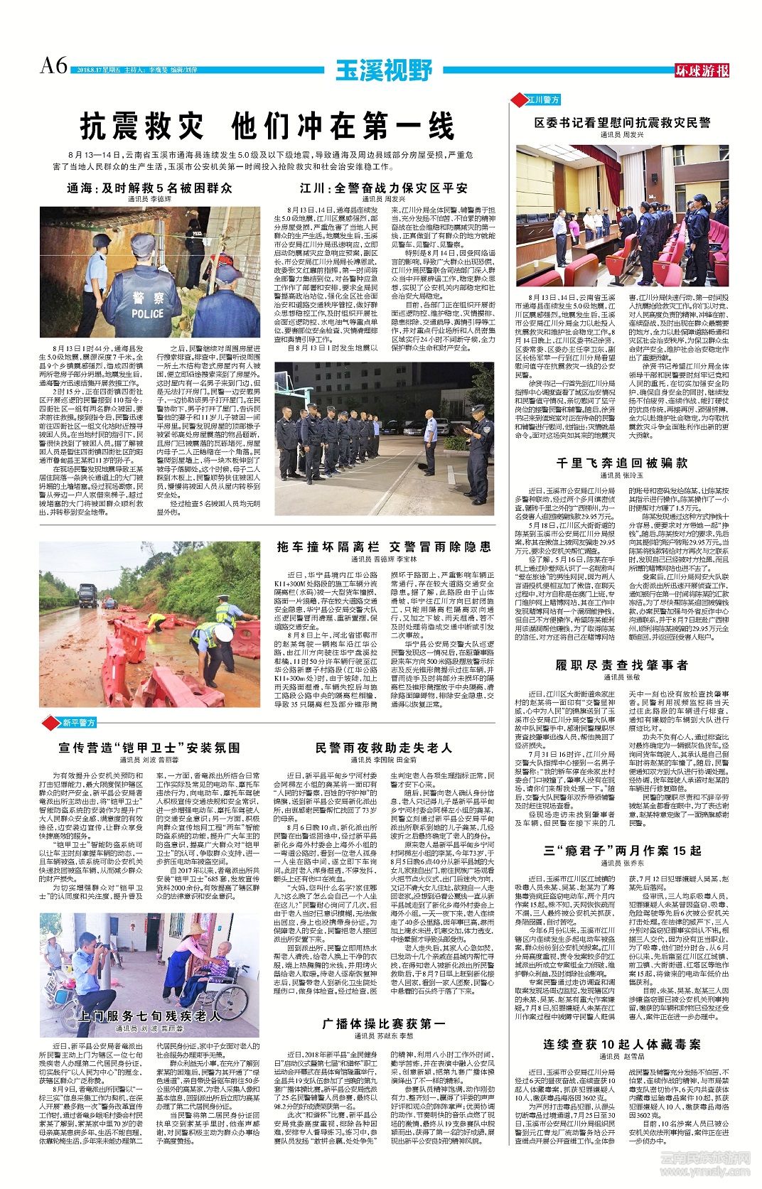 自8月13日1時發(fā)生地震以來,江川分局全體民警、輔警勇于擔當,充分發(fā)揚不怕苦、不怕累的精神奮戰(zhàn)在社會維穩(wěn)和防震減災的第一線,正真做到了有群眾的地方就能見警車、見警燈、見警察。