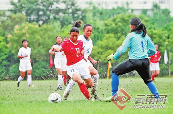 足球賽女子組麗江隊(紅衣)3:1勝昆明隊。本報記者 孫曉云 周燦 攝