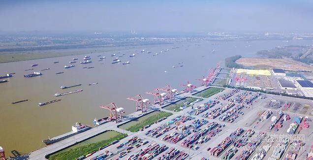 航拍長江上貨船往來,碼頭上集裝箱擺放有序(來源:新華網(wǎng))