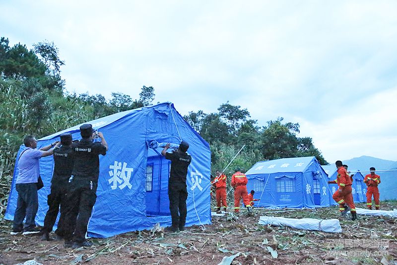 為避免發(fā)生次生災(zāi)害,由墨江縣公安局巡特警大隊(duì)、交警大隊(duì)和寧洱縣公安局民警組成的救援隊(duì),在完成搜救工作確認(rèn)無(wú)被困人員后,及時(shí)對(duì)危房設(shè)置了警戒。趕在天黑前,在村子附近較為開(kāi)闊的安全區(qū)域,搭建了40余頂帳篷,讓全村群眾有了棲身之所。