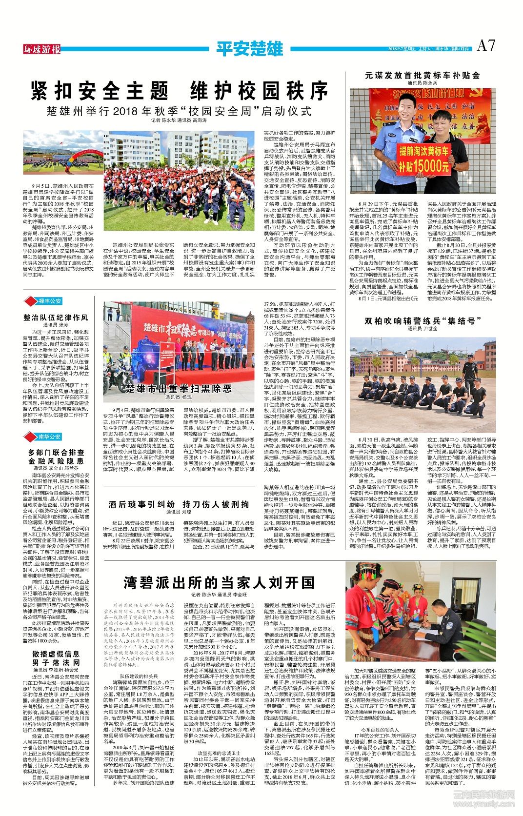楚雄州公安局局長(zhǎng)馬聞宣布啟動(dòng)儀式開(kāi)始后,武警楚雄支隊(duì)官兵特戰(zhàn)隊(duì)、消防支隊(duì)搜救犬、消防支隊(duì)消防技能和交警支隊(duì)交通指揮手勢(shì)操,先后登臺(tái)為大家獻(xiàn)上了精彩的各類表演;圍繞法治宣傳、交通安全宣傳、反恐宣傳、消防安全宣傳、防電信詐騙、禁毒宣傳、公共安全宣傳、社區(qū)警務(wù)互動(dòng)等“八進(jìn)校園”主題活動(dòng),公安機(jī)關(guān)開(kāi)展了禁毒、法治、交通安全、消防知識(shí)、反恐怖常識(shí)的宣傳,各類警用槍械、警用直升機(jī)、無(wú)人機(jī)、特種車(chē)輛、排爆機(jī)器人等警用裝備悉數(shù)亮相;衛(wèi)計(jì)委、食藥監(jiān)、安監(jiān)、司法、地震等部門(mén)開(kāi)展了一系列公共安全、人身安全等宣傳。