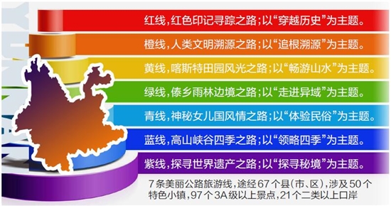 “紅橙黃綠青藍(lán)紫”,打開云南美麗公路旅游路線圖,不同顏色的旅游線一目了然。