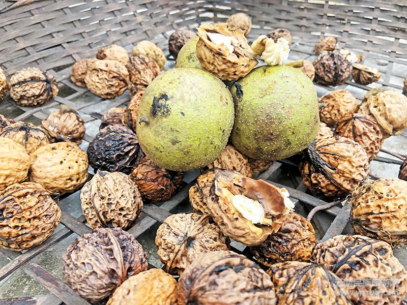 古樹太高,采摘核桃也是門技術(shù)活,需要找爬樹高手幫忙。人踩在樹枝上用長竹竿將核桃打落在地,然后再從地上一個一個的撿拾,用背簍背回來。