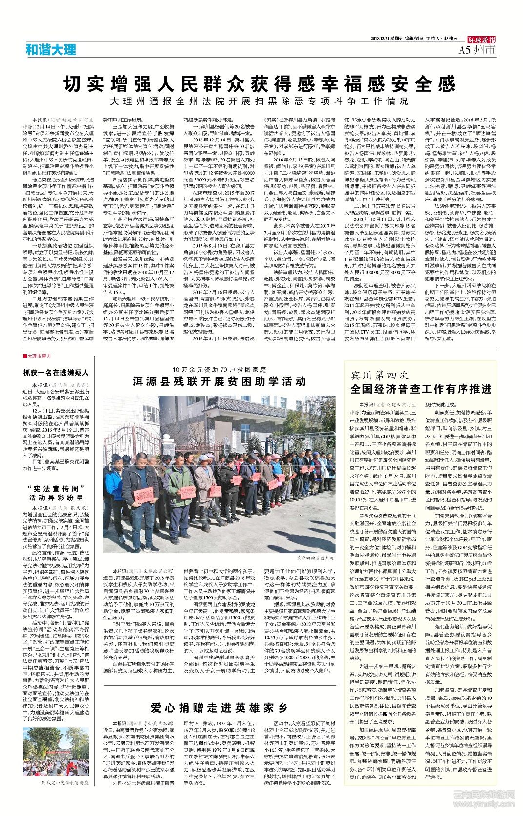 活動中,各部門、警種把“憲法宣傳周”活動與落實洱海保護、文明創(chuàng)建、掃黑除惡、脫貧攻堅、“放管服”改革等重點工作和開展“三會一課”、主題黨日等相結(jié)合,與促進“誰執(zhí)法誰普法”普法責(zé)任制落實、開展“七五”普法中期總結(jié)相結(jié)合,不斷豐富內(nèi)容、拓展形式,并運用生動的案事例、鮮活的語言為廣大人民群眾解讀憲法內(nèi)涵,進行近距離、面對面的宣傳,推動憲法宣傳在社會面全覆蓋,將憲法精神和法律知識普及到廣大人民群眾心中,為建設(shè)美麗幸福新大理營造了良好的法治氛圍。(文章來源環(huán)球游報2018年12月21日第1170期A5版)