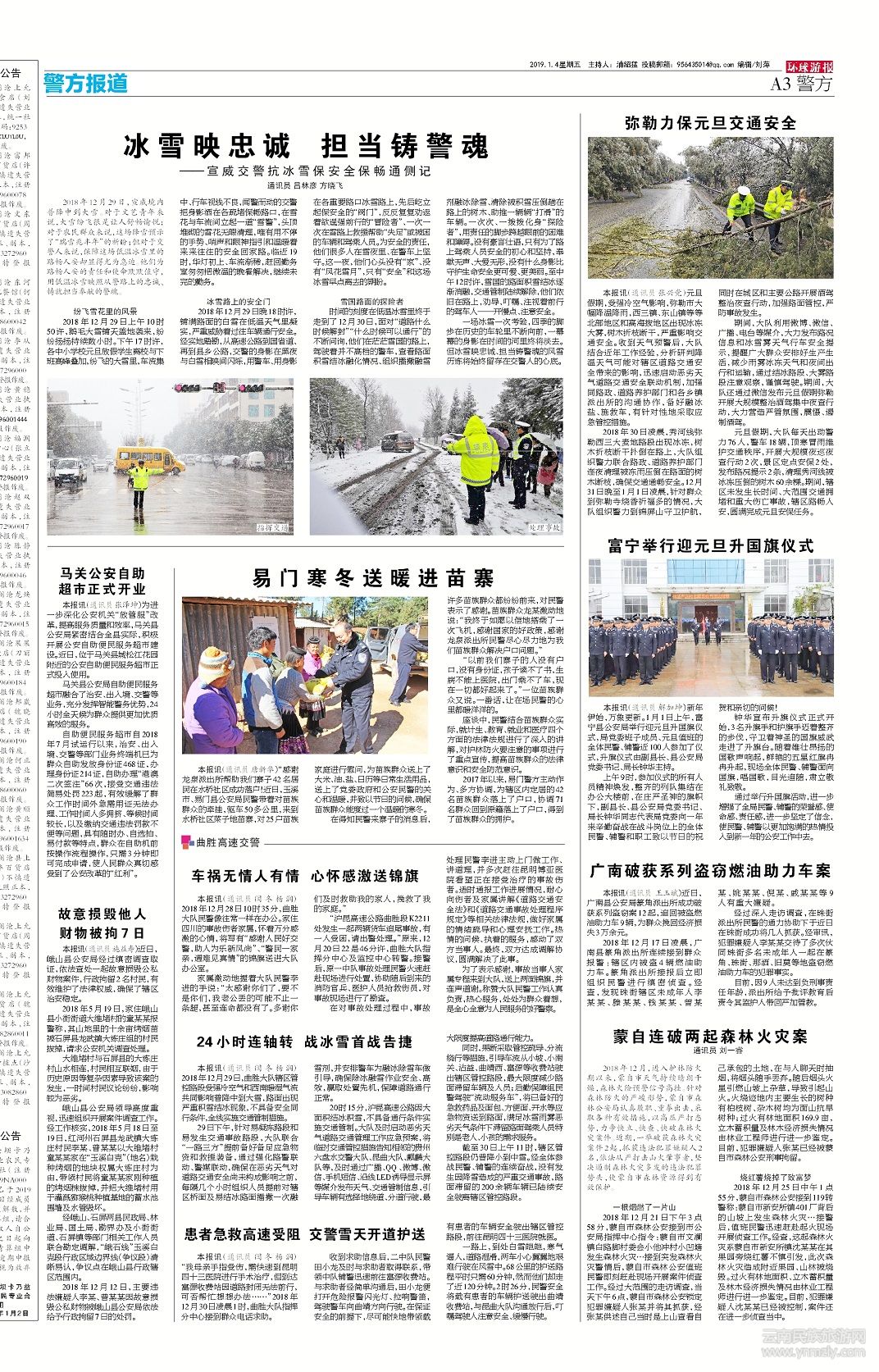 2018年30日凌晨,秀河線彌勒西三大麥地路段出現(xiàn)冰凍,樹木折枝斷干撲倒在路上,大隊(duì)組織警力聯(lián)合路政、道路養(yǎng)護(hù)部門連夜清理被凍雨壓倒在路面的樹木斷枝,確保交通通暢安全。12月31日晚至1月1日凌晨,針對群眾到彌勒寺燒香祈福多的情況,大隊(duì)組織警力到錦屏山守衛(wèi)護(hù)航,同時在城區(qū)和主要公路開展酒駕整治夜查行動,加強(qiáng)路面管控,嚴(yán)防事故發(fā)生。