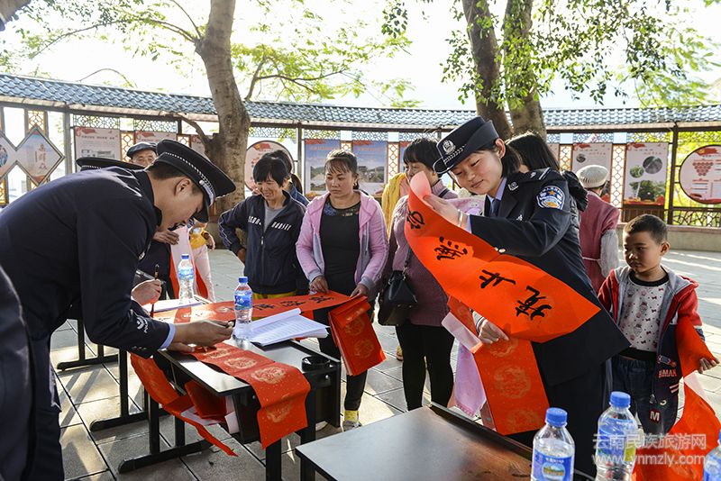 在化念鎮(zhèn)鳳凰社區(qū)平樂(lè)小組,峨山縣公安文聯(lián)的民警們拉起橫幅、擺桌子、寫(xiě)春聯(lián),忙碌開(kāi)來(lái)。平樂(lè)小組組長(zhǎng)高興地打開(kāi)村里的大喇叭,通知村民前來(lái)現(xiàn)場(chǎng)領(lǐng)取春聯(lián)。村民們聽(tīng)說(shuō)縣公安局來(lái)送春聯(lián),欣喜而來(lái),現(xiàn)場(chǎng)被圍了個(gè)里三層外三層。不多時(shí),整個(gè)書(shū)寫(xiě)現(xiàn)場(chǎng)熱鬧非凡,有的村民激動(dòng)地說(shuō):縣公安局春節(jié)來(lái)為我們送福送春聯(lián),對(duì)我們移民關(guān)心關(guān)愛(ài),真是太感謝你們啦!