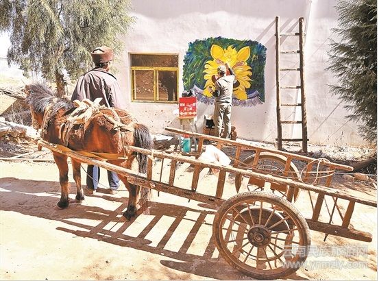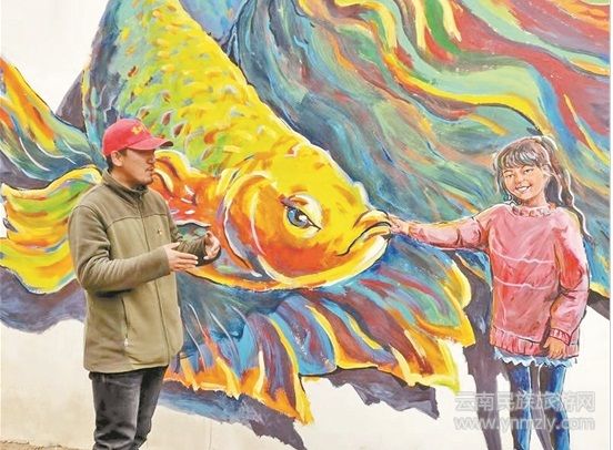 2017年2月,孫海平從昆明學(xué)院到關(guān)中村駐村后,就思考著如何把扶貧工作和自己的藝術(shù)專業(yè)結(jié)合起來。他發(fā)現(xiàn)村里新建的房子都是白墻,想把白墻利用起來。“我從事繪畫專業(yè),來到村里后,被這里美麗的自然環(huán)境所吸引,眼里看到的全是綠水青山,非常適合作畫。”于是,2017年底,孫海平邀請馬來西亞藝術(shù)大師賴偉權(quán)到關(guān)中村走訪,在石門小組村民舒順林家墻壁上畫出了第一幅壁畫——《走向新生活》。