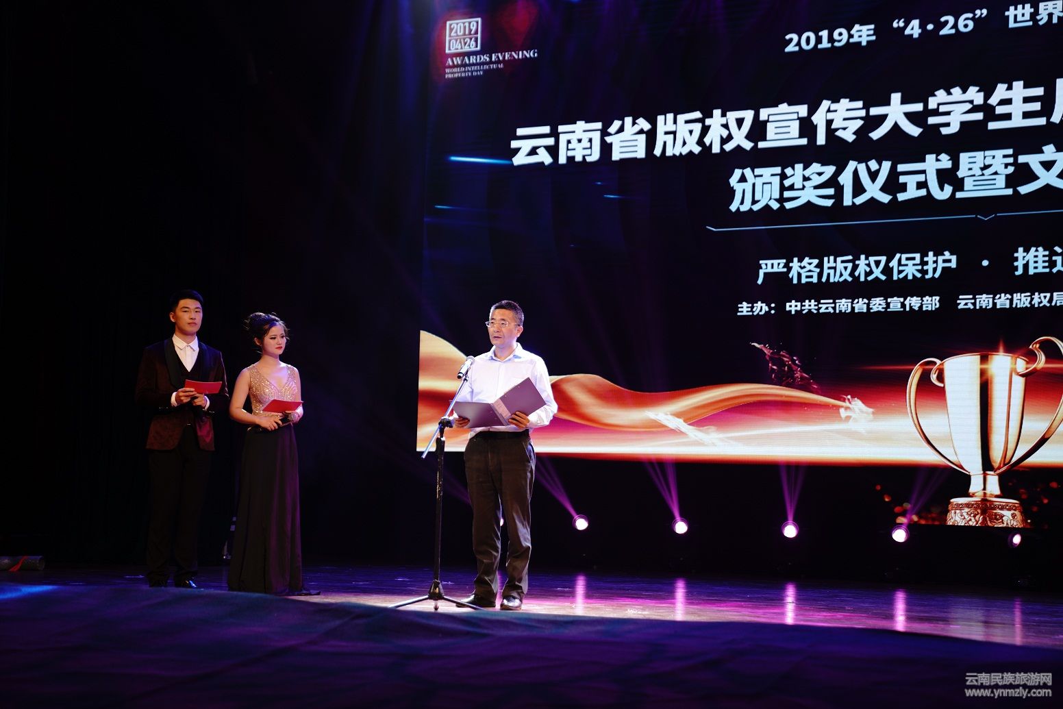 3時(shí),“2019年云南省知識(shí)產(chǎn)權(quán)宣傳周版權(quán)宣傳活動(dòng)——大學(xué)生原創(chuàng)作品征集活動(dòng)頒獎(jiǎng)儀式暨文藝演出”在演播大廳正式開(kāi)始。