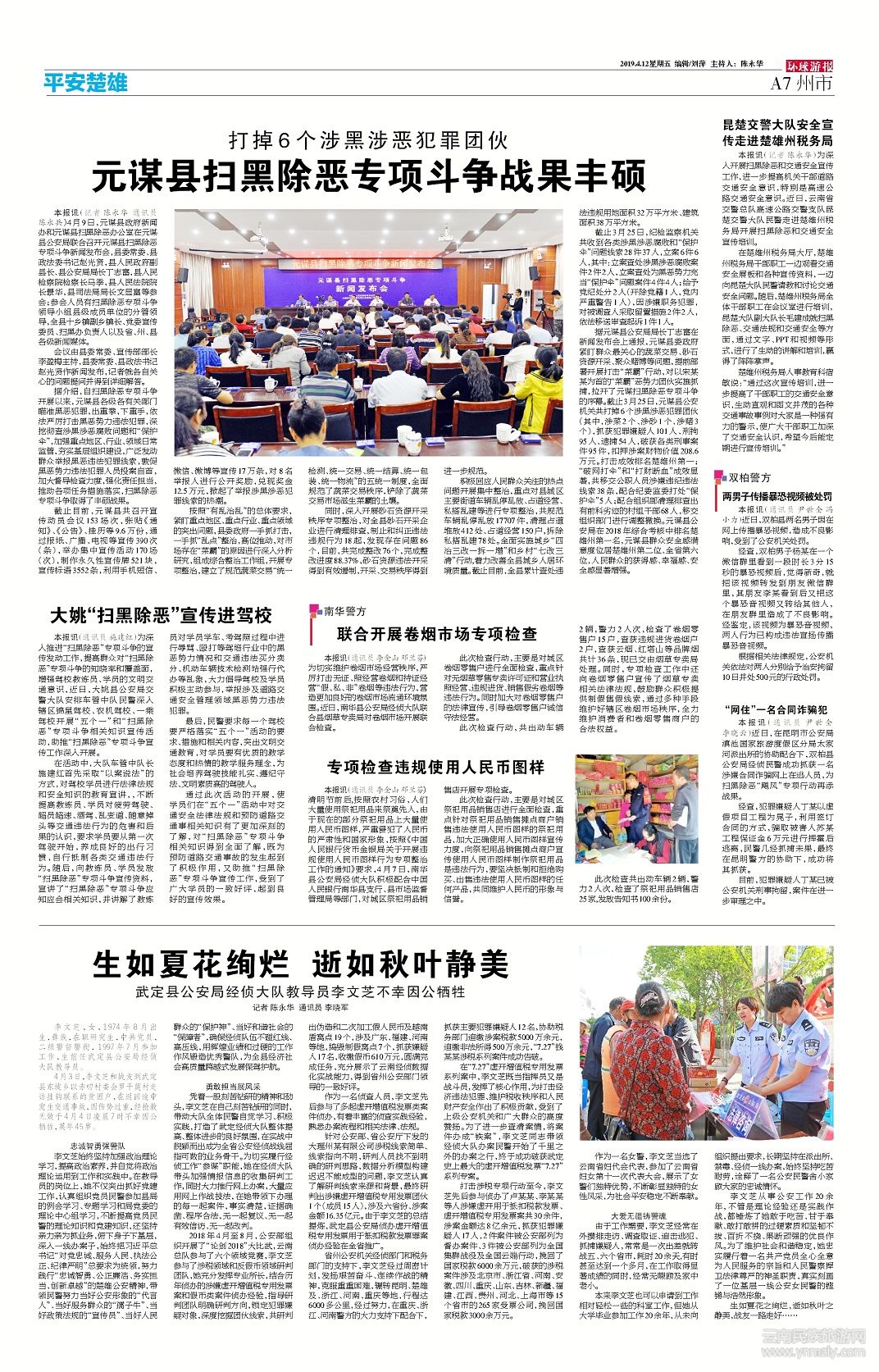 據(jù)元謀縣公安局局長(zhǎng)丁志富在新聞發(fā)布會(huì)上通報(bào),元謀縣委政府緊盯群眾最關(guān)心的蔬菜交易、砂石資源開(kāi)采、聚眾賭博等問(wèn)題,提前部署開(kāi)展打擊“菜霸”行動(dòng),對(duì)以宋某某為首的“菜霸”惡勢(shì)力團(tuán)伙實(shí)施抓捕,拉開(kāi)了元謀掃黑除惡專項(xiàng)斗爭(zhēng)的序幕。截止3月25日,元謀縣公安機(jī)關(guān)共打掉6個(gè)涉黑涉惡犯罪團(tuán)伙(其中,涉菜2個(gè)、涉砂1個(gè)、涉賭3個(gè)),抓獲犯罪嫌疑人101人、刑拘95人、逮捕54人,破獲各類刑事案件95件,扣押涉案財(cái)物價(jià)值208.6萬(wàn)元。打擊成效排名楚雄州第一;“破網(wǎng)打傘”和“打財(cái)斷血”成效顯著,共移交公職人員涉嫌違紀(jì)違法線索38條,配合紀(jì)委監(jiān)委打處“保護(hù)傘”5人;配合組織部清理排查出有前科劣跡的村組干部68人,移交組織部門進(jìn)行調(diào)整撤換。元謀縣公安局在2018年綜合考核中排名楚雄州第一名,元謀縣群眾安全感滿意度位居楚雄州第二位、全省第六位,人民群眾的獲得感、幸福感、安全感顯著增強(qiáng)。(文章來(lái)源環(huán)球游報(bào)2019年4月12日第1184期A7版)