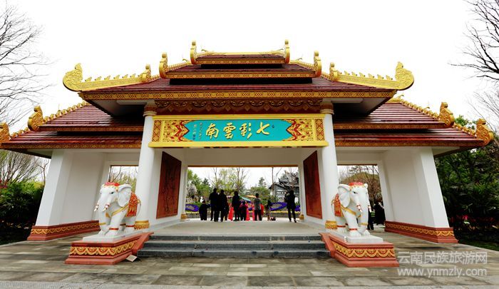 鎏金的傣族風(fēng)格門樓上寫著“七彩云南”,兩頭憨態(tài)可掬的“吉象”立于兩側(cè),這就是云南園的第一景——吉象迎賓。“吉象”以亞洲象為原型設(shè)計(jì),卷鼻造型寓意為“吉祥如意。穿過(guò)門廊,腳下是彩色鋪裝拼花的紋案,眼前是色彩斑斕的鮮花組景——雀舞廣場(chǎng)豁然呈現(xiàn)在眼前。