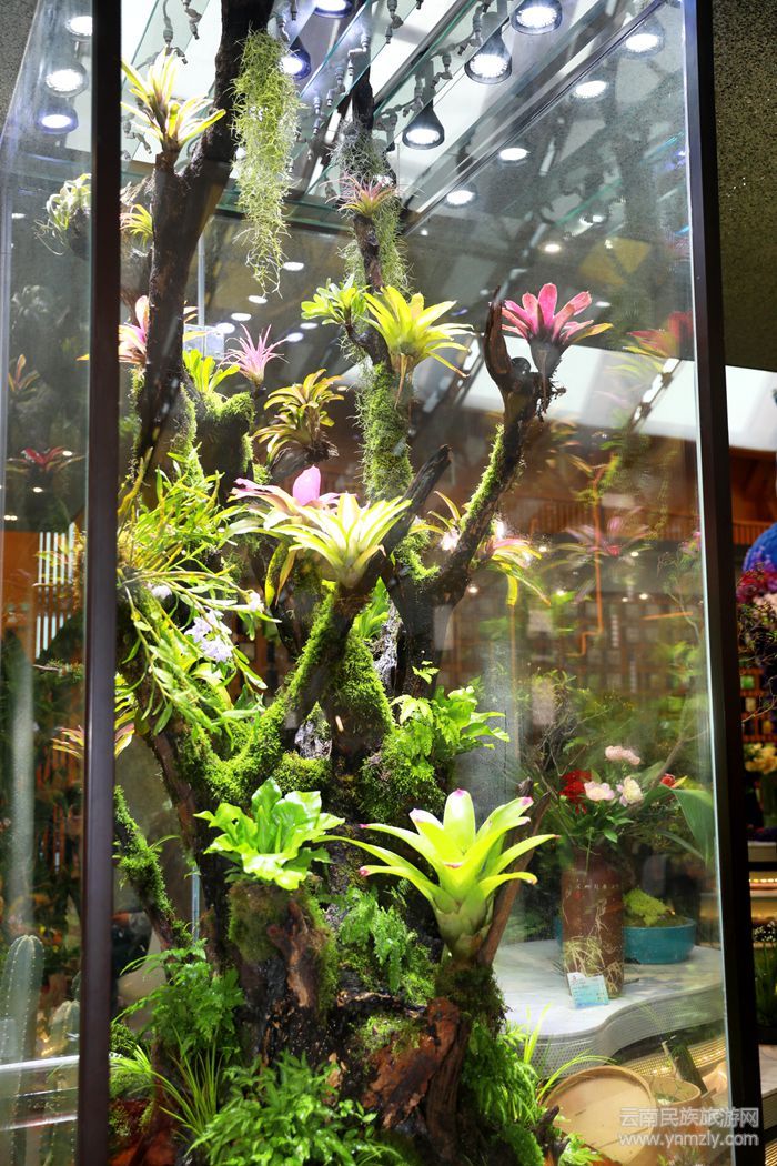 靠近它,整個(gè)人仿佛置身在雨林中,享受著陽(yáng)光和綠植的滋養(yǎng)。孔雀是云南的名片,云南館當(dāng)然也少不了它的身影。以各色鮮切花,插花,及花卉工藝品為主打造的充滿繽紛色彩的孔雀花藝,姿態(tài)旖旎,栩栩如生。后續(xù)還將呈現(xiàn)不同主題的花卉、花藝、盆景等展品。