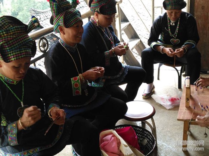 眼前的房子是棟典型的壯族的桿欄式吊腳樓,上去樓梯,幾個壯族阿姨身穿民族服飾,在忙著繡花,主人熱情地端來自釀的美酒款待遠方來的客人。