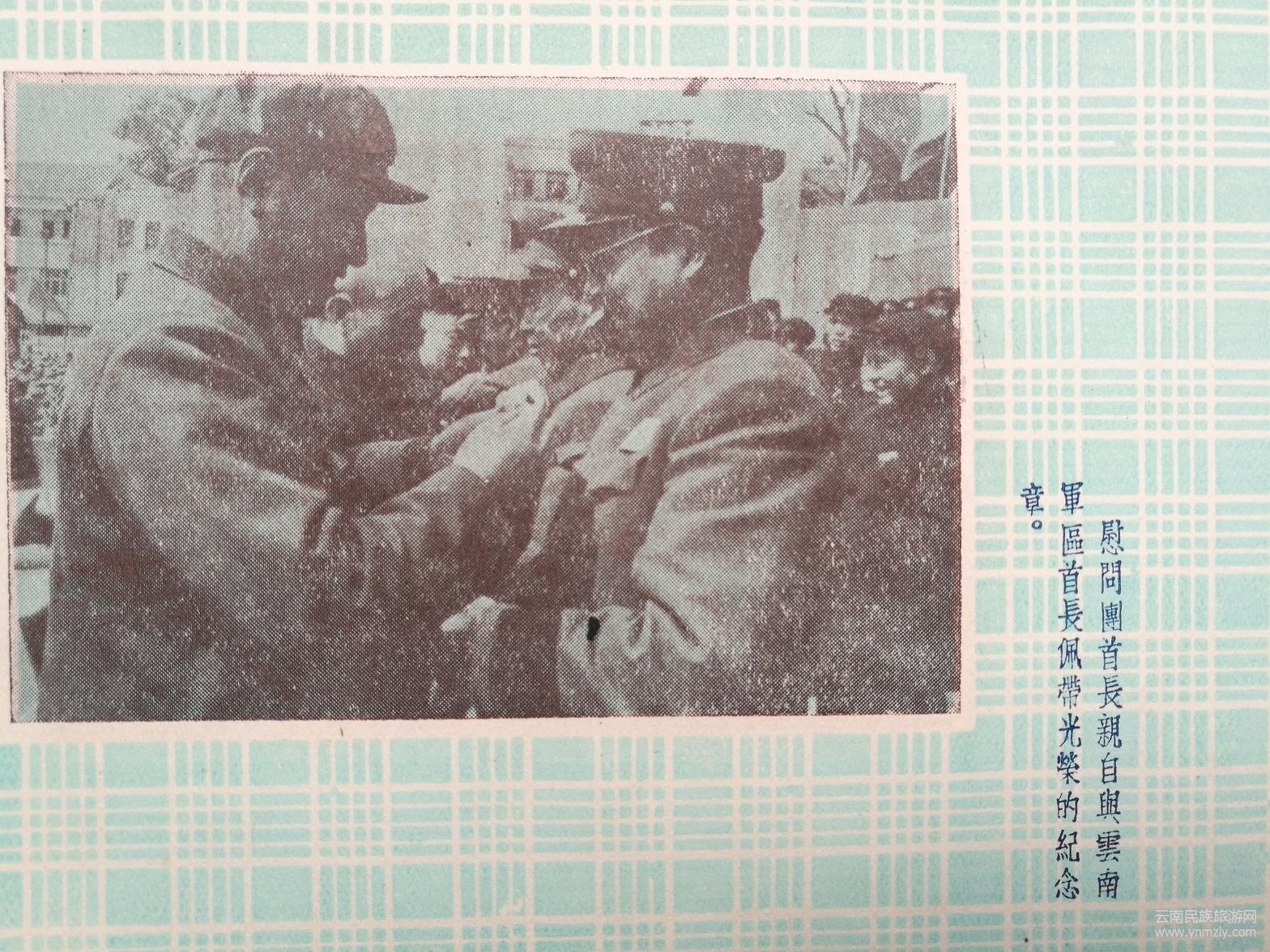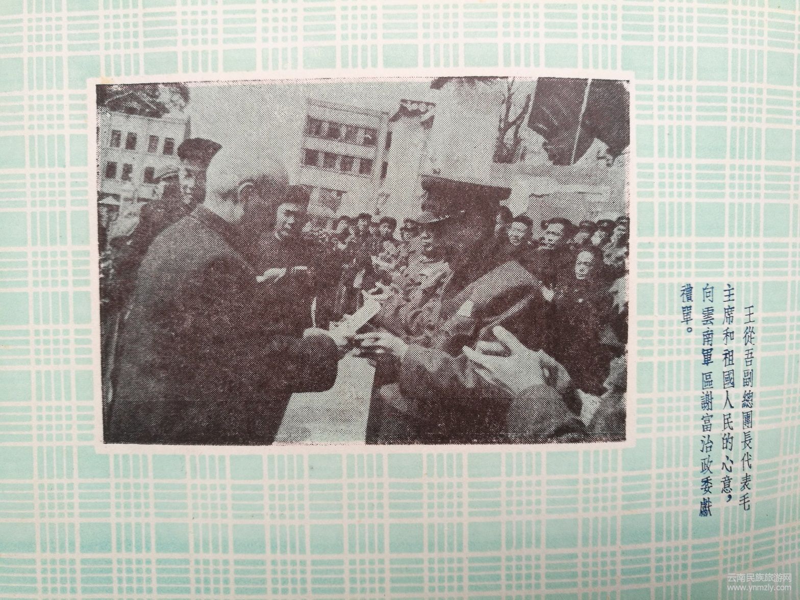 紀(jì)念冊(cè)還收集有云南軍區(qū)秦基偉副司令員在歡迎儀式上的致詞。他致詞表示,你們(代表團(tuán)全體同志)不遠(yuǎn)千里不辭勞苦的來(lái)到祖國(guó)西南邊疆,向云南軍區(qū)部隊(duì)進(jìn)行慰問(wèn),你們不僅帶來(lái)了中國(guó)共產(chǎn)黨中央、中央人民政府、毛主席和全國(guó)人民對(duì)我們的親切關(guān)懷,也帶來(lái)了毛主席關(guān)于黨在過(guò)渡時(shí)期的總路線的指示,帶來(lái)了4年來(lái)祖國(guó)經(jīng)濟(jì)建設(shè)的偉大成就。帶來(lái)了我們親密的戰(zhàn)友一一光榮的中國(guó)人民志愿軍在反侵略戰(zhàn)爭(zhēng)中的偉大勝利和寶貴經(jīng)驗(yàn)。云南軍區(qū)部隊(duì)4年來(lái)和全國(guó)各兄弟軍區(qū)部隊(duì)一樣,由于正確地執(zhí)行了中國(guó)共產(chǎn)黨和毛主席的指示,由于得到了人民的熱愛(ài)和支持,使我們?cè)诒Pl(wèi)邊疆鞏固內(nèi)防的斗爭(zhēng)中有力的打擊了帝國(guó)主義和殘匪對(duì)我邊境的寢擾,把守住了祖國(guó)西南的大門。