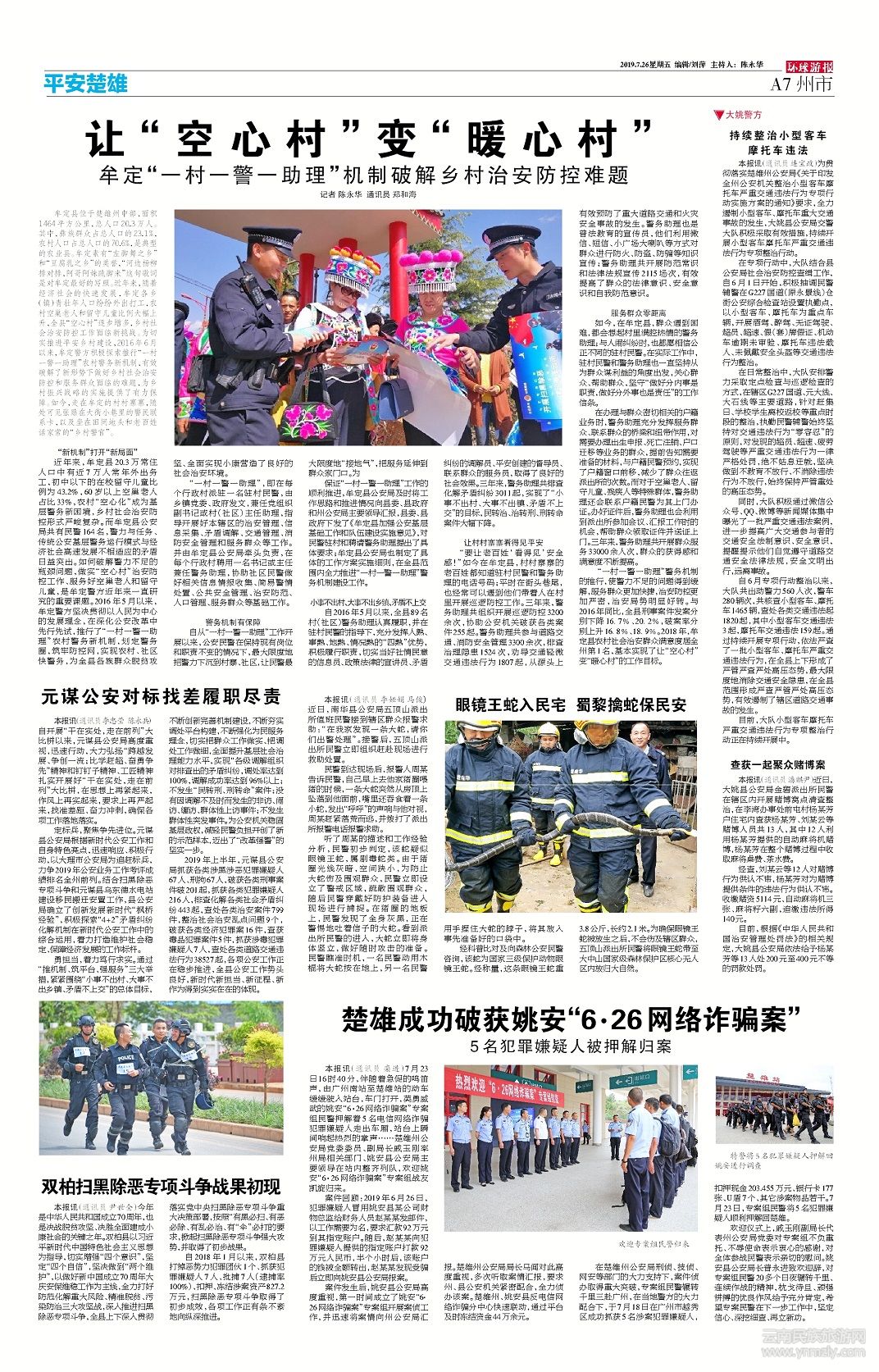 歡迎儀式上,戚玉剛副局長代表州公安局黨委對專案組不負(fù)重托、不辱使命表示衷心的感謝,對全體參戰(zhàn)民警表示親切的慰問。姚安縣公安局長普永進致歡迎辭,對專案組民警20多個日夜輾轉(zhuǎn)千里、連續(xù)作戰(zhàn)的精神,枕戈待旦、頑強拼搏的優(yōu)良作風(fēng)給予充分肯定,希望專案民警在下一步工作中,堅定信心、深挖細(xì)查、再立新功。(文章來源環(huán)球游報2019年7月26日第1196期A7版)