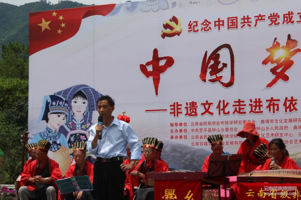6月28日,由云南省民族學會布依學研究委員會、曲靖市文化發(fā)展研究中心指導;中共羅平縣鐘山鄉(xiāng)黨委政府、曲靖市洞經(jīng)音樂協(xié)會主辦;“紀念中國共產(chǎn)黨成立98周年、新中國成立70周年“中國夢 布依情”非遺文化走進布依山寨魯布革主題文藝演出”(以下簡稱主題文藝演出)在羅平縣魯布革布依山寨精彩亮相。云南省民族學會布依學研究委員會會長韋光文作指導發(fā)言。演出活動由曲靖市洞經(jīng)音樂藝術(shù)團主持人古麗華主持,來自省市縣鄉(xiāng)四級領導嘉賓與鐘山鄉(xiāng)魯布革村的廣大群眾以及魯布革完小的師生約500余人觀看演出。