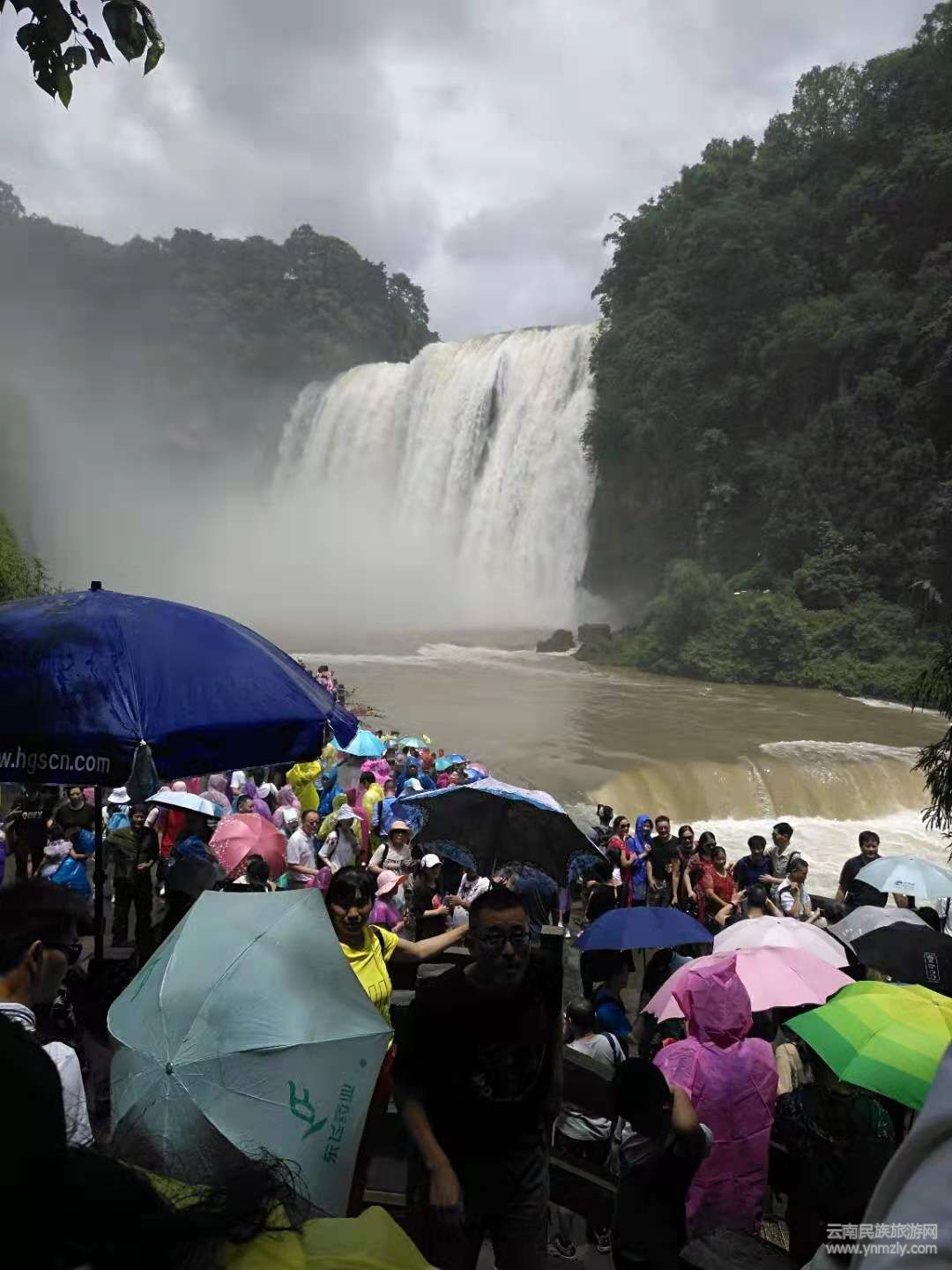 稍前近觀,瀑布如黃河倒傾,峭壁震顫,谷底轟雷,十里外也能聽到咆哮聲。由于水流的強(qiáng)大沖擊力,濺起的水霧可彌漫數(shù)百米以外,使坐落在瀑布左側(cè)崖頂上的寨子和街市,也常被濺起的水霧所籠罩。
