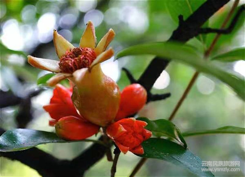 同學(xué)家的三間土坯房面向牛欄江,后面是盤山公路,門前橫著一條石板鋪就的小路,不是很寬,兩人能并肩而行。路旁是密密麻麻的一排枝條向各個(gè)方向伸長(zhǎng),錯(cuò)落交叉著。綠葉不大,反襯了最誘人的是滿樹(shù)紅花。石榴花張揚(yáng)的開(kāi)放,含苞待放的,脹鼓鼓的,把臉撐得彤紅;從花苞里噴出的那一半,得以解放后的歡快,盡情的展示鮮紅的裙擺;仰天長(zhǎng)嘯的是完全開(kāi)放的,在微風(fēng)中載歌載舞。