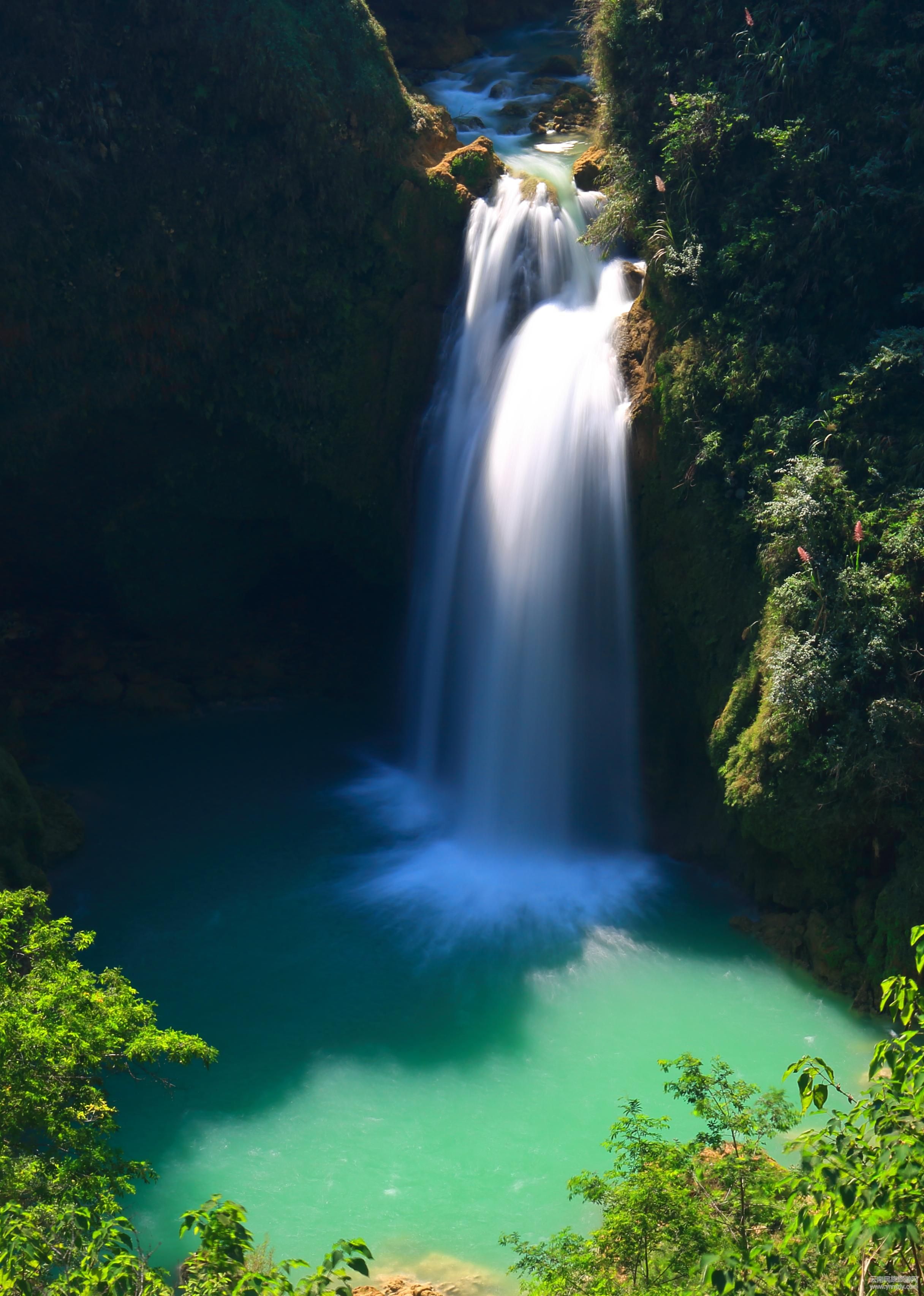 的衛(wèi)士,偉岸威武,凝神專注。大樹之上是湛藍(lán)的碧空,巖石之下是飛花的瀑影。碧空中白云如絮,朵朵飄逸,瀑影里激流如絲,條條成簾。瀑布兩側(cè)植被翠綠,苔蘚覆岸,一彎峽谷瀑聲震耳,彩虹隱現(xiàn),兩岸丘田稻谷金黃,稻香醉人。瀑流從120余米的懸崖墜下,形似不規(guī)則的“之”字,經(jīng)三級懸?guī)r激流和三溏深潭回旋后復(fù)歸常態(tài)一路奔騰流向遠(yuǎn)方。