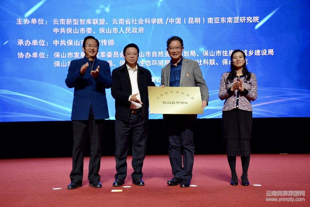 論壇現(xiàn)場,云南省新型智庫聯(lián)盟理事長、云南省社會科學(xué)院 中國(昆明)南亞東南亞研究院黨組書記、院長、研究員何祖坤同志為保山新型智庫授牌,中共保山市委宣傳部長李汶娟為授牌儀式作見證并主持下午的主題發(fā)言。