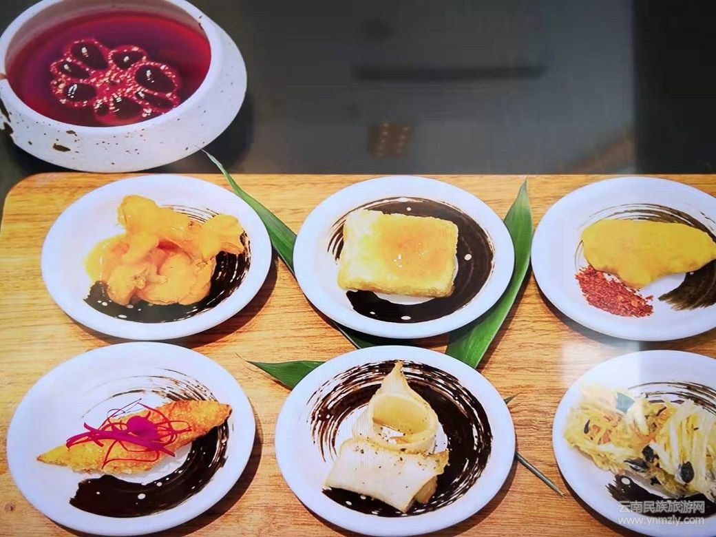 第三道七星蓮,這道菜是由六碟金色酥香的菜品加上一碟藍莓脆藕組成。七碟菜品象征北斗七星。蓮花是道教的象征,取蓮藕配以藍莓,清口解膩。云峰靈驗山常年受七星的照耀,愿你在這里增福祿、添壽禧,滿足您的美好心愿。
