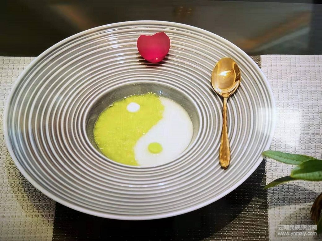第七道甜品,太極布丁,這道甜品采用太極八卦的形式呈現(xiàn),太極講究陰陽調(diào)和,萬事萬物互相轉(zhuǎn)化與影響。太極在道家一般是指,宇宙最原始的秩序狀態(tài),出現(xiàn)于陰陽未分的混沌時期(無極)之后,而后形成萬物(宇宙)的本源。這道菜,圓盤碟子中間用椰汁與獼猴桃汁水做原材料,一白一黑的兩種汁水經(jīng)過冷凍制作而成的布丁,形狀為一陰一陽的太極八卦,口味酸甜冰冷入口即化。這種搭配立刻就把之前吃在口里的油膩感瞬間消失,把爬山后腿腳酸軟感一沖而走,留在口里的只有酸甜舒爽的感覺。
