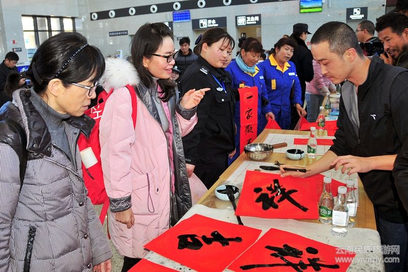 1月10日,昆明鐵路公安局開(kāi)遠(yuǎn)公安處在轄區(qū)內(nèi)彌勒高鐵站開(kāi)展紅火喜慶的“祖國(guó)新春好 送福進(jìn)萬(wàn)家”活動(dòng),鐵路民警們與受邀的開(kāi)遠(yuǎn)和彌勒兩市文聯(lián)協(xié)會(huì)的4位書法家現(xiàn)場(chǎng)揮毫潑墨,為歸途旅客送上新春祝福。