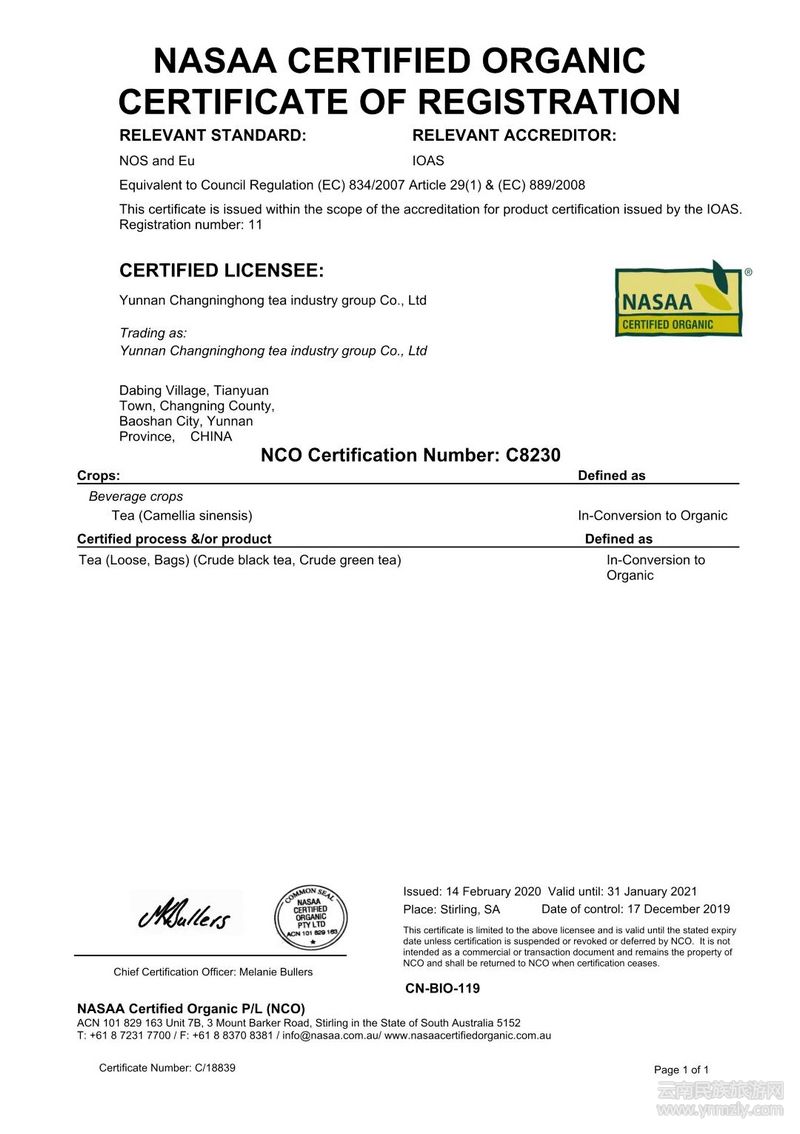 云南民族旅游網(wǎng)訊:春茶生產(chǎn)季節(jié)即將來臨,正在有序復(fù)工復(fù)產(chǎn)的昌寧茶企、茶農(nóng)開展春茶生產(chǎn)前準(zhǔn)備的關(guān)鍵時期,素有“千年茶鄉(xiāng)”之稱的保山市昌寧縣收到了一份特別的喜報——云南昌寧紅茶業(yè)集團(tuán)收到了經(jīng)NASAA CERTIFIED ORGANIC可持續(xù)農(nóng)業(yè)組織認(rèn)證頒發(fā)的歐盟、美國有機(jī)產(chǎn)品認(rèn)證證書。