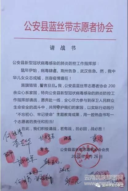 云南民族旅游網(wǎng)訊:2020年1月,新型冠狀病毒引發(fā)的肺炎疫情開(kāi)始蔓延。危難之際,公安縣“藍(lán)絲帶”志愿者協(xié)會(huì)會(huì)長(zhǎng)、支部副書(shū)記甘輝芳來(lái)到縣疫情防控指揮部,遞上會(huì)員們簽字按著紅指印的請(qǐng)戰(zhàn)書(shū),用一腔熱血書(shū)寫(xiě)了他們的責(zé)任和擔(dān)當(dāng)。短時(shí)間內(nèi),在黨員的帶領(lǐng)下,廣大會(huì)員紛紛行動(dòng)起來(lái),奔赴疫情一線陣地。