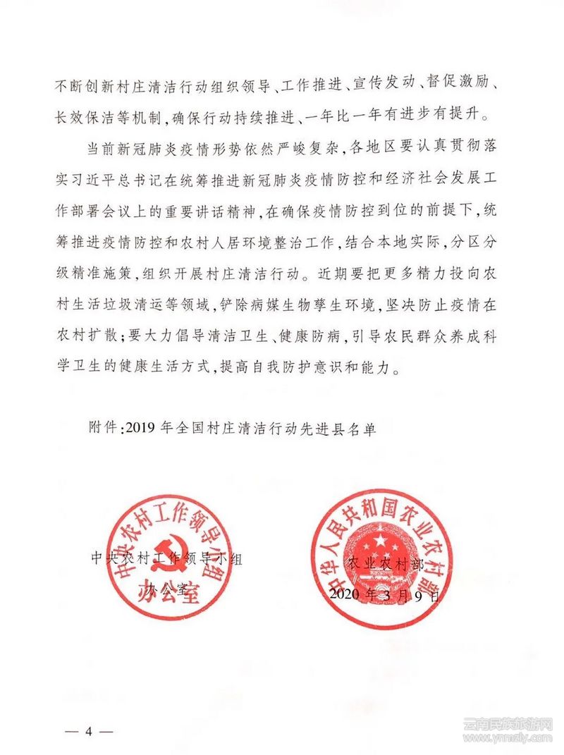 為發(fā)揮示范帶動作用,進一步激發(fā)廣大干部群眾開展村莊清潔行動、推進農(nóng)村人居環(huán)境整治的積極性主動性,中央農(nóng)辦、農(nóng)業(yè)農(nóng)村部日前印發(fā)《關于通報表揚2019年全國村莊清潔行動先進縣 深入開展2020年村莊清潔行動的通知》,對北京市門頭溝區(qū)等106個措施有力、成效突出、群眾滿意的全國村莊清潔行動先進縣予以通報表揚,并對下一步工作作出部署安排。《通知》指出,2018年12月,中央農(nóng)辦、農(nóng)業(yè)農(nóng)村部等18個部門聯(lián)合印發(fā)《農(nóng)村人居環(huán)境整治村莊清潔行動方案》。一年來,各地區(qū)采取有效措施、迅速組織推進,全國90%以上的村莊動了起來,有力推動了農(nóng)村人居環(huán)境整治工作面上推開,一大批村莊村容村貌得到明顯改善。《通知》強調(diào),各地區(qū)要以“干干凈凈迎小康”為主題,推動村莊清潔行動常態(tài)化、制度化、持續(xù)化。立足“清”,突出清理死角盲區(qū),由“清臟”向“治亂”拓展,由村莊面上清潔向屋內(nèi)庭院清潔、村莊周邊清潔拓展。聚焦“保”,建立健全長效機制,實現(xiàn)村莊由一時清潔向保持長期干凈整潔轉(zhuǎn)變。著力 “改”,更加注重引導農(nóng)民轉(zhuǎn)變不良生活習慣,培養(yǎng)衛(wèi)生健康意識和環(huán)境保護理念。促進“美”,將村莊清潔行動與農(nóng)村生活垃圾污水治理、發(fā)展鄉(xiāng)村產(chǎn)業(yè)、建設文明鄉(xiāng)風等有機結合,促進外在美向內(nèi)在美、持續(xù)美轉(zhuǎn)變。《通知》要求,各地區(qū)要采取更加有力有效的推進措施。明確差別化整治標準,根據(jù)“清理農(nóng)村生活垃圾、清理村內(nèi)塘溝、清理畜禽養(yǎng)殖糞污等農(nóng)業(yè)生產(chǎn)廢棄物”任務完成情況,分類確定整治目標。持續(xù)加大宣傳力度,堅持干部帶動、農(nóng)民出動、社會發(fā)動、節(jié)點行動,充分發(fā)揮媒體宣傳作用和群團組織優(yōu)勢,開展多形式的評比活動,將村莊清潔納入村規(guī)民約。強化監(jiān)督激勵,通過檢查督導、明察暗訪、考核評比等進一步壓實縣鄉(xiāng)責任,通過民眾隨手拍、舉報、曝光等強化社會監(jiān)督,通過通報表揚、獎勵激勵等調(diào)動干部群眾積極性。創(chuàng)新工作機制,不斷創(chuàng)新村莊清潔行動組織領導、宣傳發(fā)動等工作機制,確保行動持續(xù)推進。