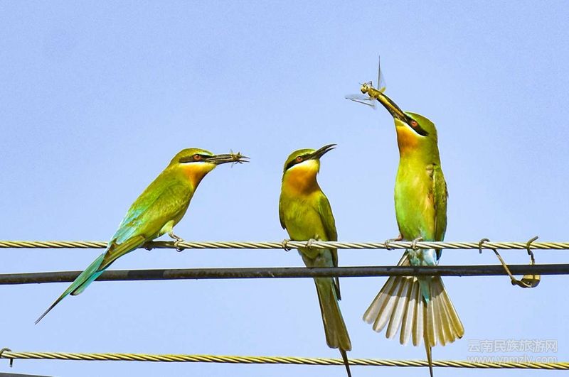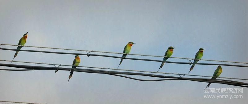 2020年4月8日下午,保山青華海國家濕地公園管理中心的工作人員在東河邊開展鳥類監(jiān)測(cè)的時(shí)候,發(fā)現(xiàn)了一群30只左右的栗喉蜂虎。它們時(shí)而停留在河邊的電線或柳樹枝頭上,時(shí)而歡快跳躍于低矮灌木叢中,時(shí)而于飛翔中捕食蜻蜓、蛾子等昆蟲。這是自2019年以來栗喉蜂虎第2次來到青華海,而且這次的種群數(shù)量比去年多了很多。