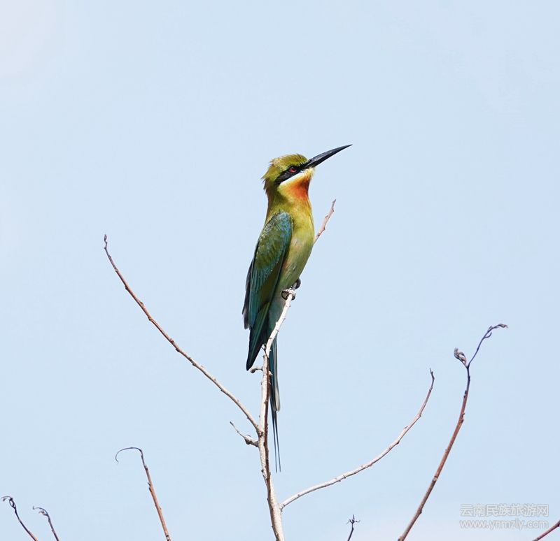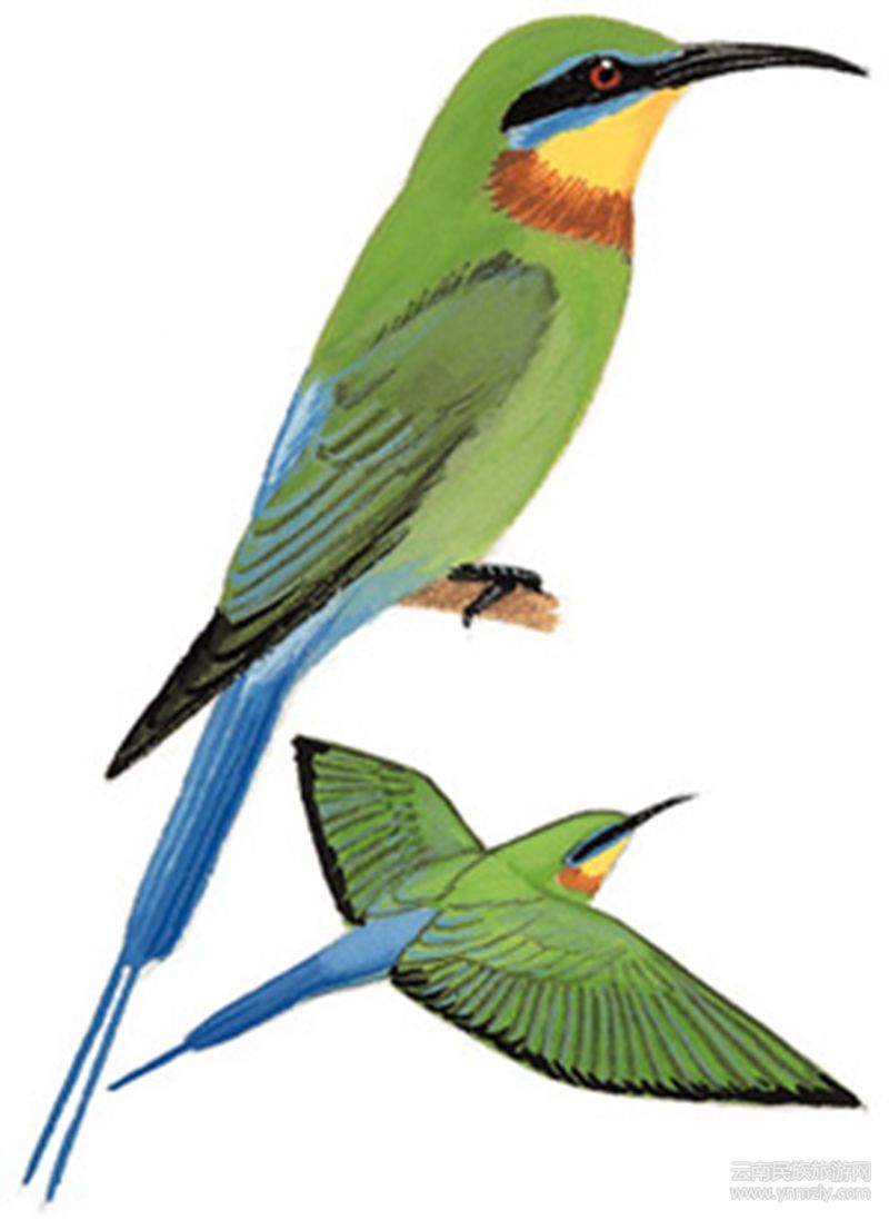 學(xué)名Merops philippinus,為中型鳥類,體長(zhǎng)約25-31cm。頭部、枕部和背部為綠色,具有一條寬闊的黑色貫眼紋,貫眼紋上下又各具一藍(lán)色窄紋,喉部栗紅色,其余下體藍(lán)綠色,腰部和尾為藍(lán)色,中央尾羽延長(zhǎng);虹膜紅色,嘴黑色、細(xì)長(zhǎng)而向下彎曲。在陽光的照射下,全身閃爍著金屬般的艷麗光澤,被譽(yù)為“中國最美麗的鳥”。主要以鱗翅目、蜂類、白蟻、蟬等各種飛行性昆蟲為食。繁殖期4-6月,營巢于河流、溪邊較陡峭的土質(zhì)巖壁上。