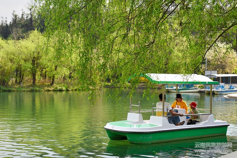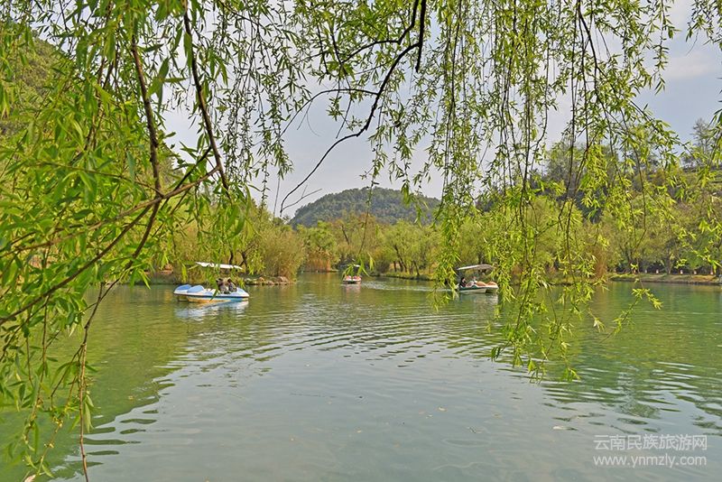 站在柳蔭下放眼,潭中三五只小船慢慢地劃動,和著濃濃的春意,在湖面蕩起一層層綠色波紋。劃船賞春的,有老有小,各得其樂。最顯眼的是一條紫色頂棚的小船上,三個一襲白衣的女子,時而拍照、時而說笑、時而打鬧,恍若落入凡間的天仙,在這一方清泉中流連。