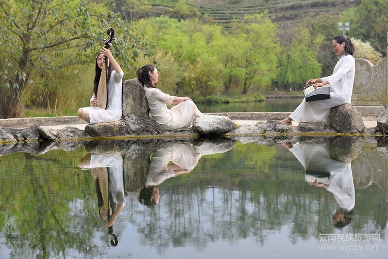 橋頭的潭,清澈而平靜,如一面天空之鏡,忠實地記錄著夕陽、天空、云朵的變化。夕陽的柔光下,三名白衣飄飄的女子,裊裊婷婷地落到潭邊,琵琶、古箏合奏的《琵琶語》,委婉地闡釋著什么叫“琴瑟和諧”。