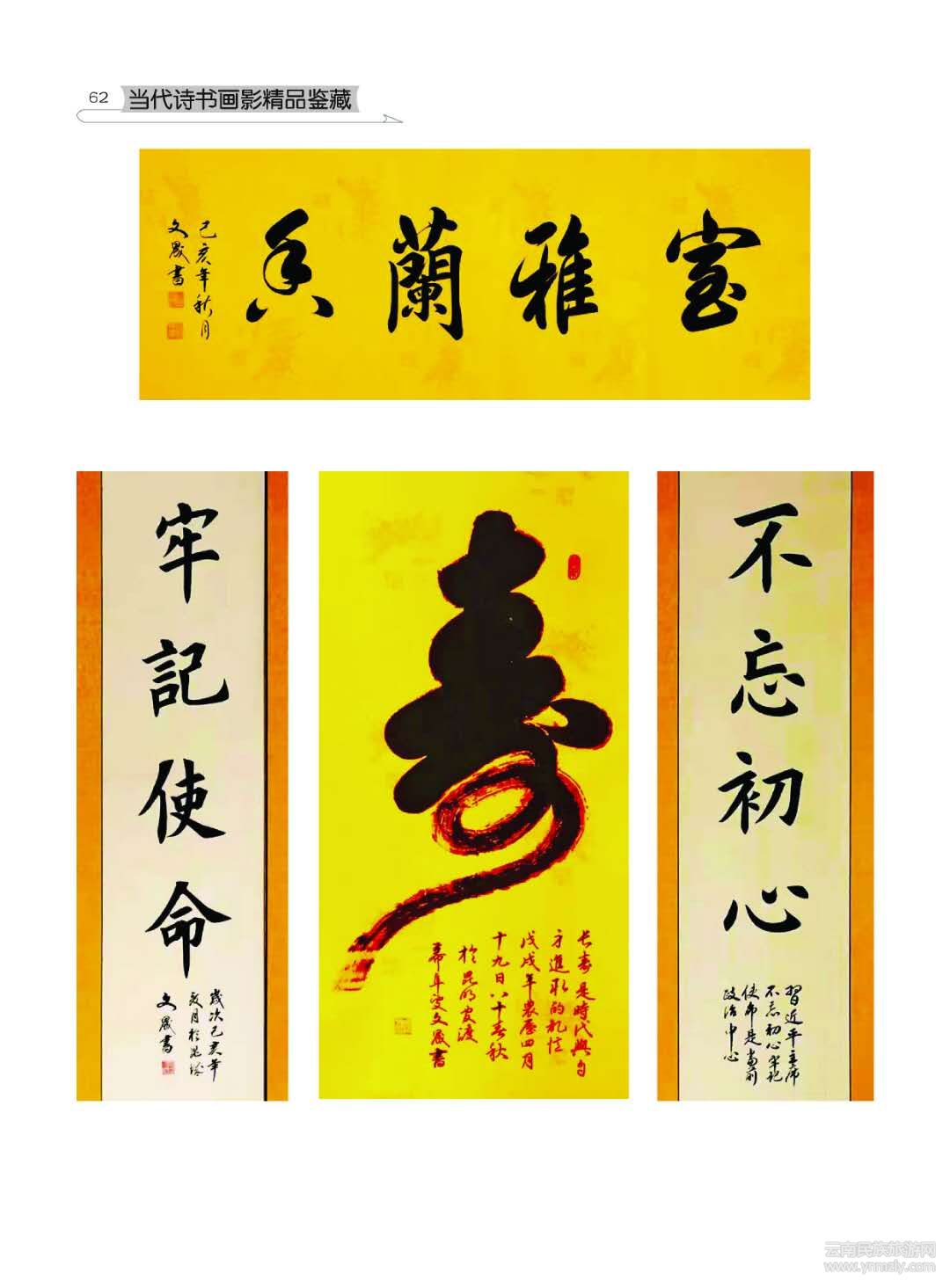 此畫冊系為慶祝新中國成立70周年而特別推出,該書收錄了中書協(xié)教授兼中楷藝研院副院長孫文佳、中國高級美術工作者高丹鳳、作家書法家攝影家周祖玉等37位作者的詩書畫和攝影作品1000多幅(首),絕大多數(shù)都屬上乘之作。如錢根余的行書《天耀中華》、楊詠昆的隸書《愛我中華》、代晴的國畫《綠水青山》、徐忠禮的工筆畫《錦上添花》周祖玉的影配詩《金龍騰飛》等一大批作品深受藏家和消費者喜愛。