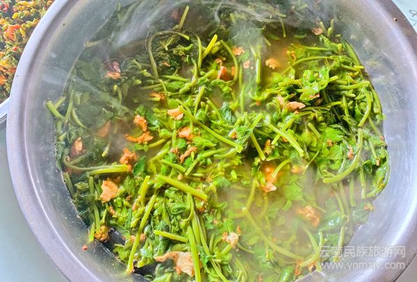 夕陽沒入最后一絲光亮,夜幕還未徹底降臨,深藍中透著一絲清綠,夜色還未濃郁到泛黑,拖拖拉拉的徘徊在將夜未夜,一點點浸染白日的余暉,染成一片青色天空,飄忽的火焰煨黃了小罐里的茶葉,女主人手腳麻利張羅出了可口的野菜佳肴:禿頭黨參蛋花湯、野芹菜拌水豆豉、青椒炒肉.....