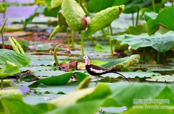 最美的,要數(shù)那只“莫名”游歷而來(lái)的水雉。水雉因其有細(xì)長(zhǎng)的腳爪,能輕步行走于睡蓮、荷花、菱角、芡實(shí)等浮葉植物上,且體態(tài)優(yōu)美,羽色艷麗,被美稱為“凌波仙子”。