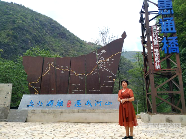 汽車從山頂一路盤旋而下,拐過一個彎道,惠通橋紀念標志赫然躍入眼簾。“共赴國難 還我河山”八個大字向我們訴說著當年的悲壯,“滇西抗戰(zhàn)第一槍在這里打響”的碑文及石刻上的數(shù)字,向我們講述著當年發(fā)生在這里的故事,那是滇西人民英勇抗敵的見證!