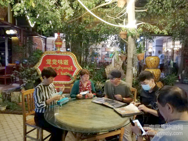 6月2日晚間,原瑞麗市僑聯(lián)工作人員、現(xiàn)任瑞麗市殘聯(lián)理事長、老朋友李楨(左一)邀約攝制組成員感受瑞麗市邊貿(mào)夜間的茶市,聆聽了解當?shù)卮鲎屣L土人情的傳說。