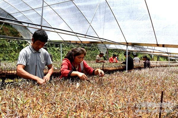 當?shù)卮迕窬徒鼊展ぃ瑘D為村民正在中草藥種植基地上打理石斛苗