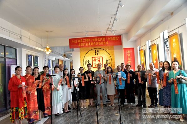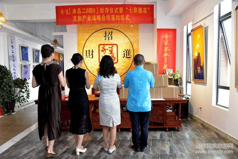 云南民族旅游網(wǎng)訊(文圖尹紹平 李關(guān)富)以丁昌勝先生七彩蓮花畫作為元素,結(jié)合冰島古樹普洱茶相互疊加的焱蓮【冰島二0四0茶磚】收藏封存儀式于一個(gè)吉祥的日子一2020年8月8日在紫云青鳥丁昌勝美術(shù)館圓滿舉辦。丁昌勝美術(shù)館與四川成都的桐鳳文創(chuàng)“七彩蓮花”文創(chuàng)產(chǎn)業(yè)戰(zhàn)略合作簽約儀式也同時(shí)成功舉行。