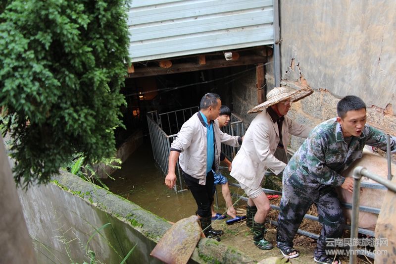人民需要我,我定不負人民。姚關街組八組戶劉海杰戶、姚關街八組劉海澄戶,積水淹掉了院子,已達沒過膝蓋的高度,開始灌進堂屋。接到群眾求救電話后,這些基層一線干部第一時間趕到了受災群眾家中。派出所民警先蹚過越來越深直至沒過膝蓋的水,疏散了群眾,查看受災情況。緊接著,姚關鎮(zhèn)干部、村干部進到群眾受災的家中,和派出所民警一起,合力將家具家電搬出了積水的房屋。還沒等反應過來,這群人已經(jīng)火速趕往下一戶受災農(nóng)戶姚關街十組李富民戶家中,戶受災嚴重的是豬圈,6頭母豬,還有剛生不久的12頭小豬。李富民妻子急得跺腳,眼里噙著淚水,語無倫次地說:這些豬就這么泡在水里,這可是我們家的命,怎么辦啊?派出所民警、鎮(zhèn)村兩級干部二話沒說猛地鉆進了積水沒過小腿的豬圈里,和著豬糞、豬食的渾水根本阻擋不了他們那顆急切挽救人民群眾生命財產(chǎn)安全的熾熱的心。泡在積水里受驚的豬很難驅趕出來,尤其是其中兩頭懷有小豬,他們想盡辦法,耐心驅趕,無畏無懼,又仔細注意,路滑鋪草,合力將兩百多斤的豬抬進貨車里。費了九牛二虎之力,終于將6頭母豬救出積水中,仔細一看,他們的腿上、腳踝上留下了星星點點的劃傷、擦傷,脫下雨鞋一倒,臭水嘩然而出。受災群眾李富民看著自家那6頭被及時救出的母豬,連忙對著他們說:感謝共產(chǎn)黨,感謝政府,謝謝你們,謝謝了,謝謝!而他們只是靦腆一笑,叮囑受災群眾注意后續(xù)安全,有情況及時聯(lián)系后便走了,留下了一個又一個平凡又高大的背影。