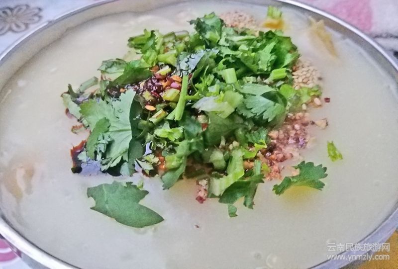 昌寧也有漿米線。上班路上有個不大的早點攤,兩口鍋、一張桌,一個面帶微笑的大娘。大娘賣的是昌寧傳統(tǒng)的漿米線,不加肉帽,花生、芝麻、姜末、蒜末、辣椒油、花椒油、蒜油、芫荽……該有的佐料一樣不少。放好佐料吃一口,還是記憶里的味道,吃進口中的,不只是早點,還有鄉(xiāng)愁。