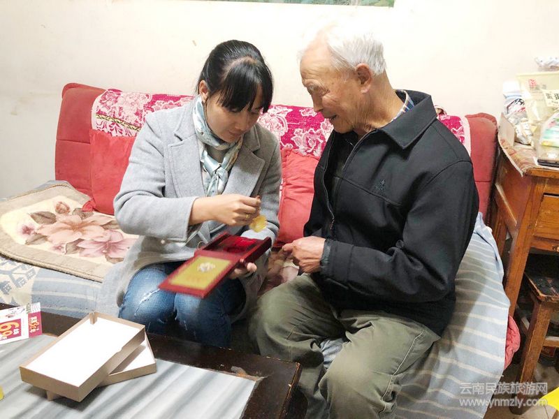 得知慰問組要來,尋甸縣94歲離休干部馬常選早早的把自己的各種勛章、紀念章整整齊齊的佩戴在胸前,老早就在家門口等待,閃閃發(fā)亮的紀念章,折射出崢嶸歲月的光輝,老人依然是那樣意氣風發(fā)、英氣逼人。他曾參加過參加了河南、湖南、廣西和海南島解放戰(zhàn)爭和抗美援朝。他談論起當年那段激情燃燒的歲月,依然記憶猶新猶在眼前,“當年抗日,冰天雪地、缺衣少食,我們不怕死,腦子里沒別的念頭,就一定要想辦法發(fā)敵人攆走。在朝鮮戰(zhàn)場由于我們沒有掌握制空權,當時,美國飛機瘋狂到低飛,掛到30多米高的電線桿,飛機確沒有掛壞。中國請求斯大林支持我們高射炮,然后調了九百多人到沈陽學習。我當時抱著“打倒美帝國主義”的決心,學習高射炮技術很認真……”回憶起艱苦的烽火歲月和殘忍的侵略者,老人感慨頗深,令在場人員為之動容,深知如今的美好生活來之不易。最后老人家提議,親自背誦老澤東的四首詩詞給大家聽。