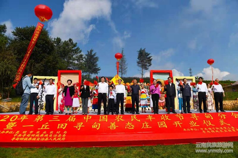 云南民族旅游網(wǎng)(記者 吳敏昆)金秋十月瓜果遍地,稻谷飄香,適逢國慶中秋雙節(jié)當天,昆明市2020年中國第三屆農(nóng)民豐收節(jié)尋甸分會場活動現(xiàn)場人頭攢動、熱鬧非常,來自四面八方的游客與尋甸各族人民群眾一道來這里體驗原滋原味的生態(tài)旅游,共同參與尋甸一丘田善態(tài)莊園開業(yè)儀式。