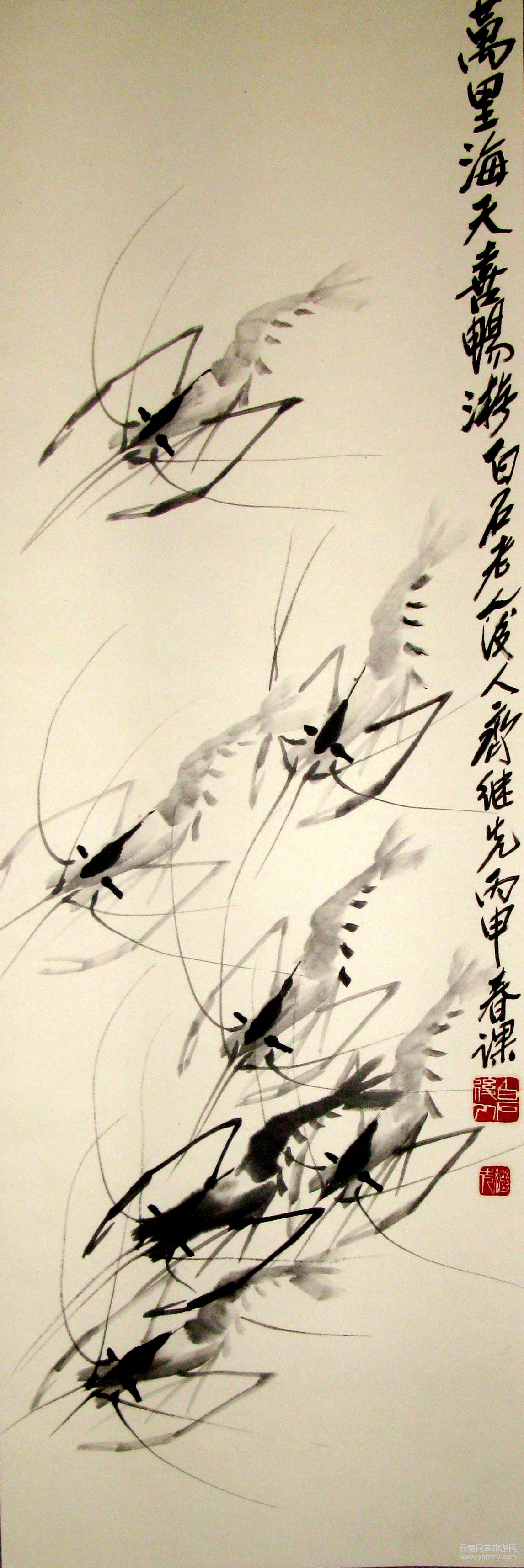 他說(shuō):“祖母曾在一次授課時(shí)說(shuō),線是藝術(shù)基礎(chǔ)的筆法。齊派藝術(shù)蝦中的點(diǎn)、塊,線是核心的。不管畫(huà)什么物體,像畫(huà)花、畫(huà)葉、畫(huà)藤、畫(huà)鳥(niǎo)、畫(huà)山、畫(huà)水,都離不開(kāi)線。線的提、按、頓、挫掌握好了,蝦畫(huà)也就好了,筆墨的交融關(guān)系也就撐握好了。所以,我很重視線的運(yùn)用,重視線在蝦畫(huà)中的表現(xiàn)。所畫(huà)的蝦也最多,體會(huì)也最深。”